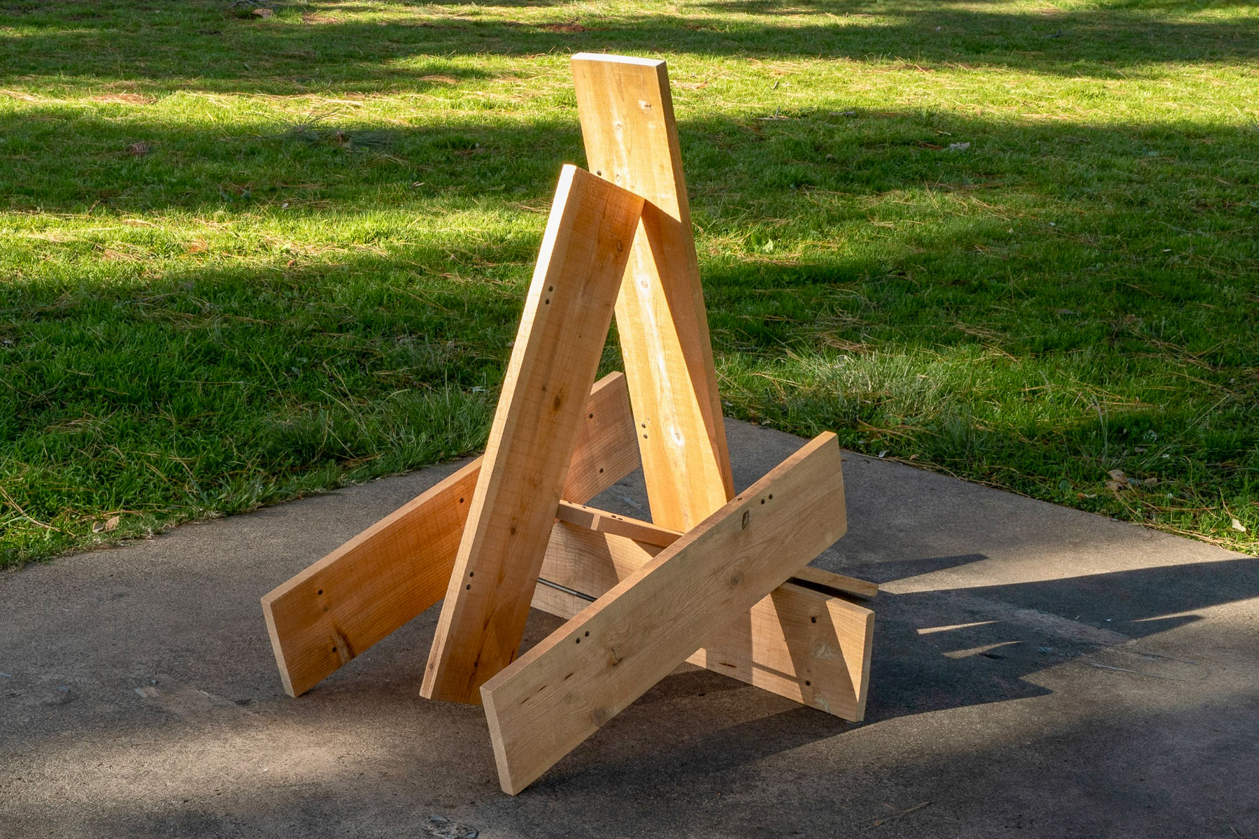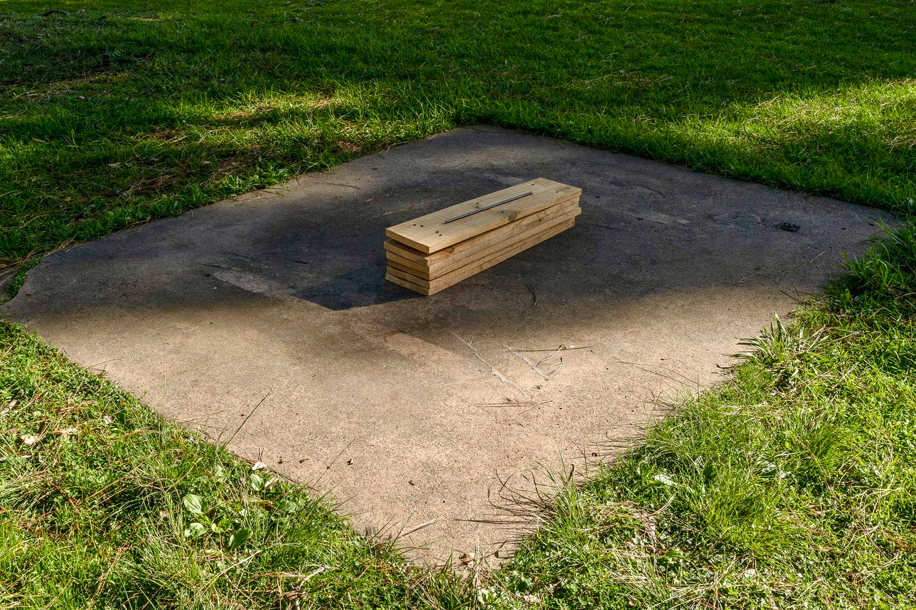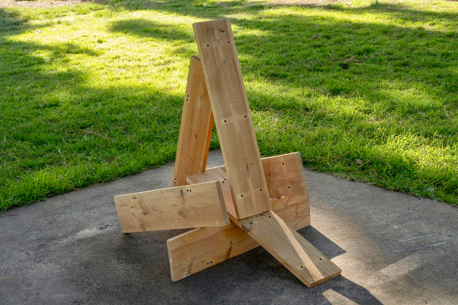 Spray paint, found broken concrete block, vintage wooden dowel, new wooden dowel, Japanese "Do Not Enter" Caution Tape, repurposed melamine board, pine