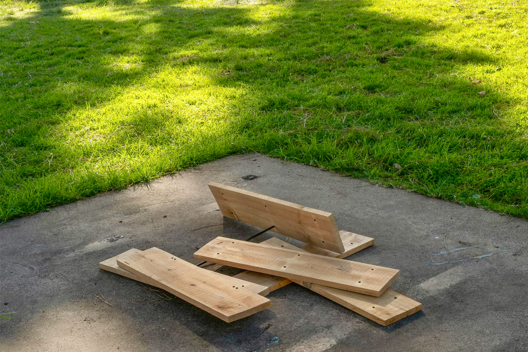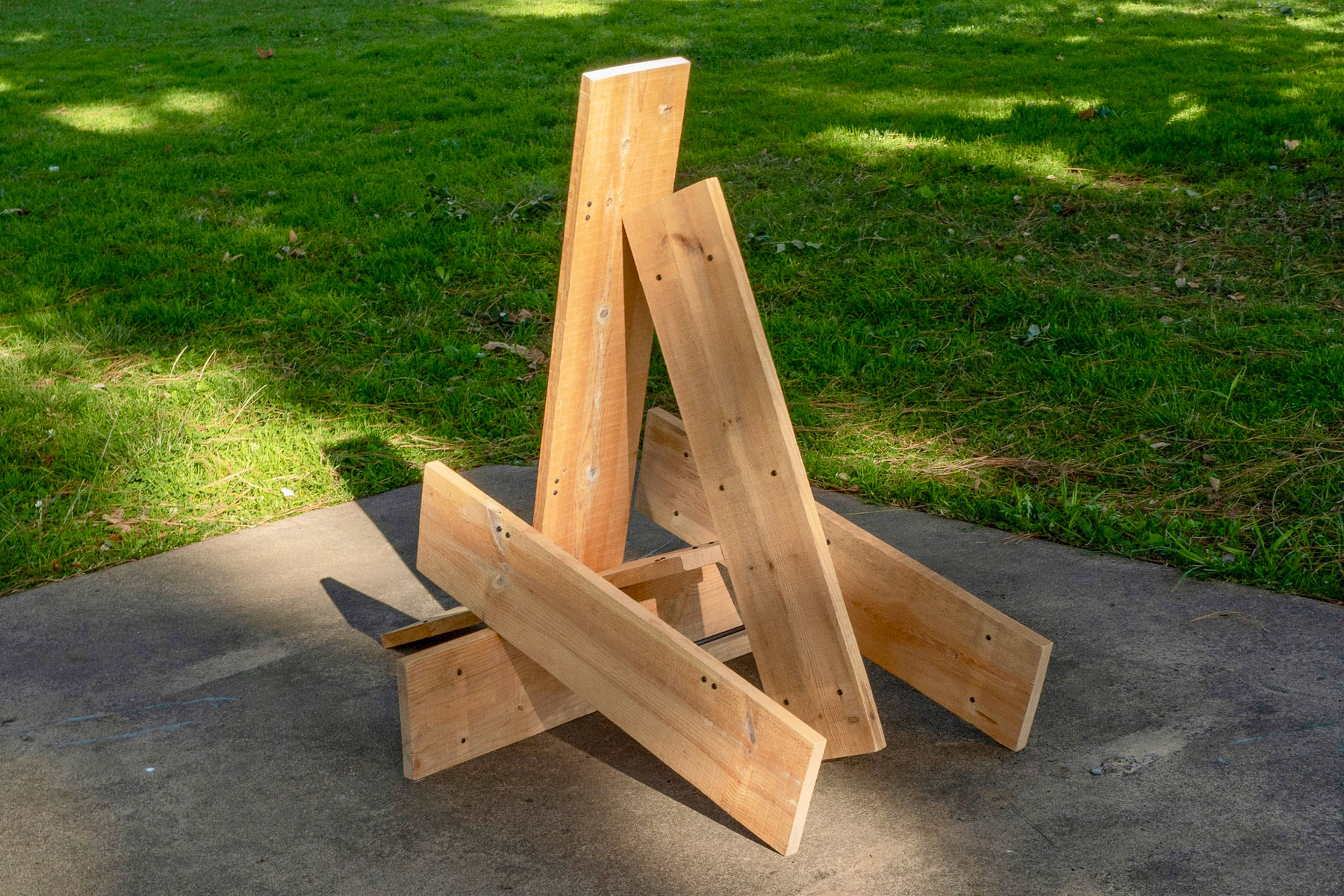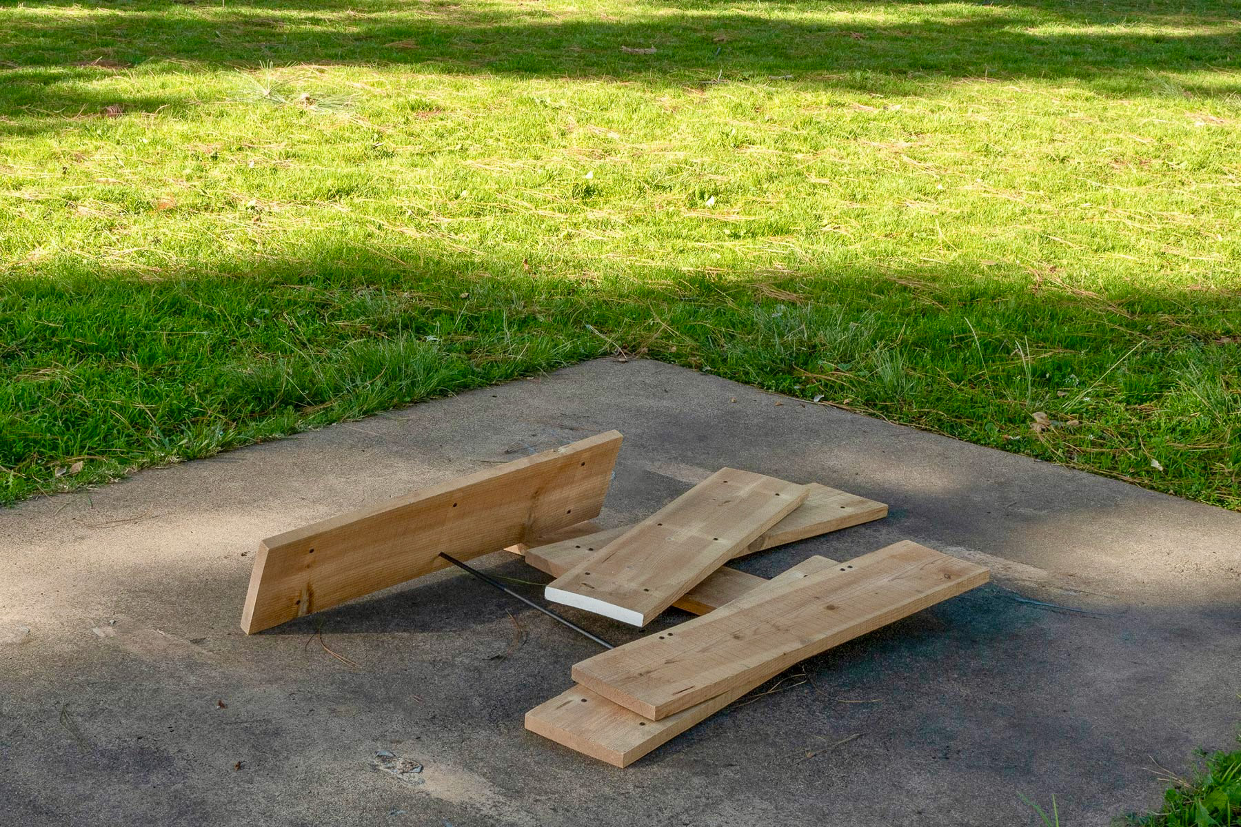 Spray paint, found steel round rod, black pan head screws to fill preexisting holes, scrap lumber