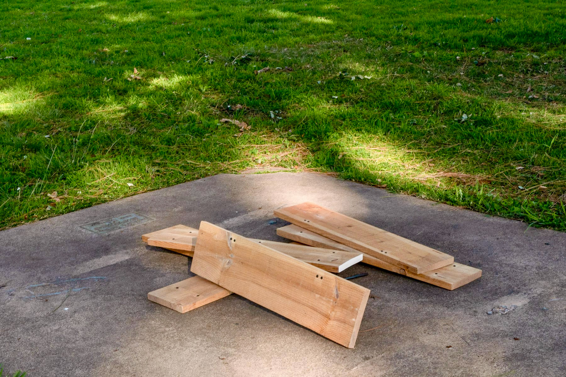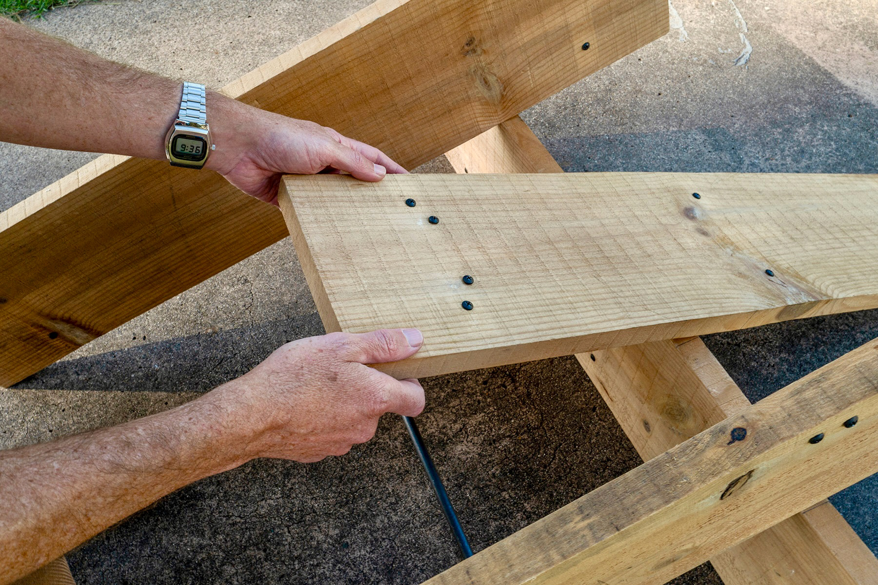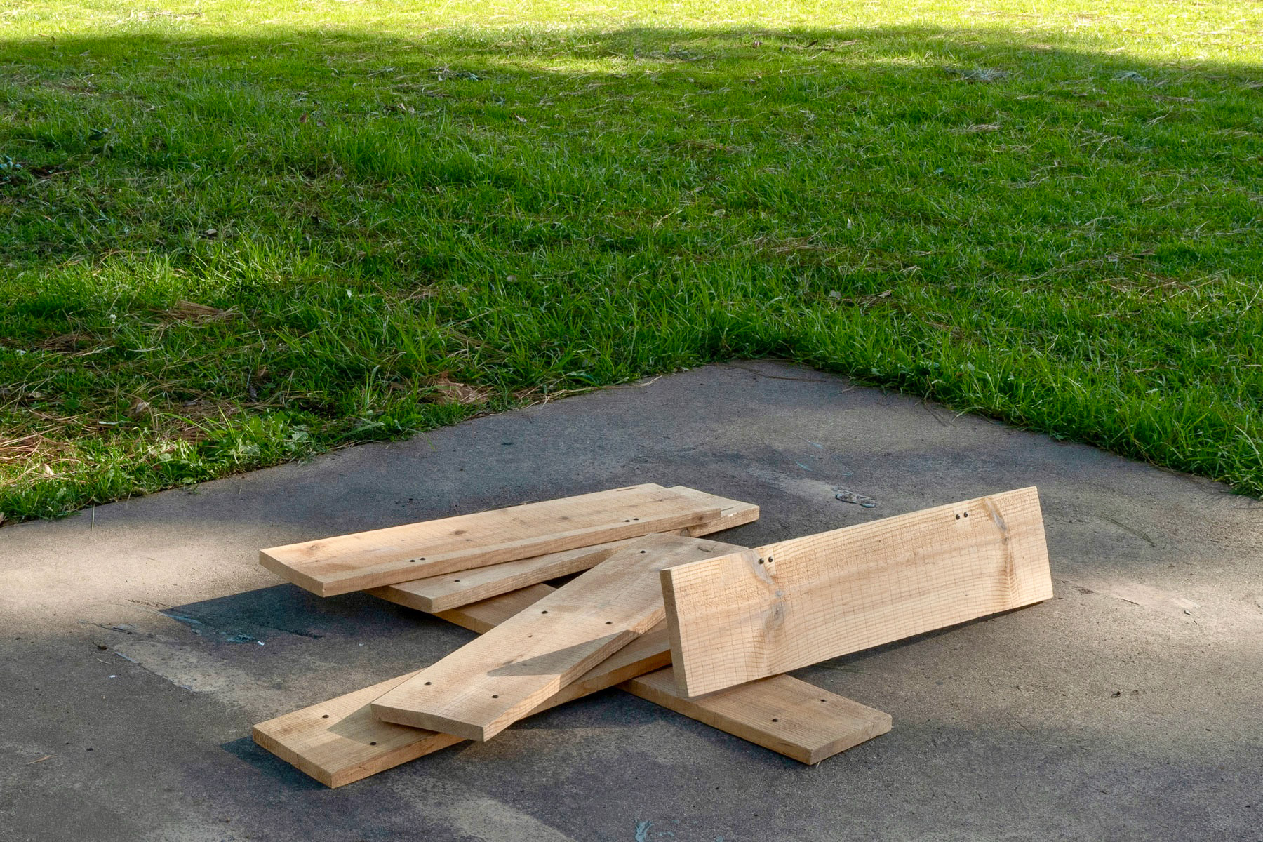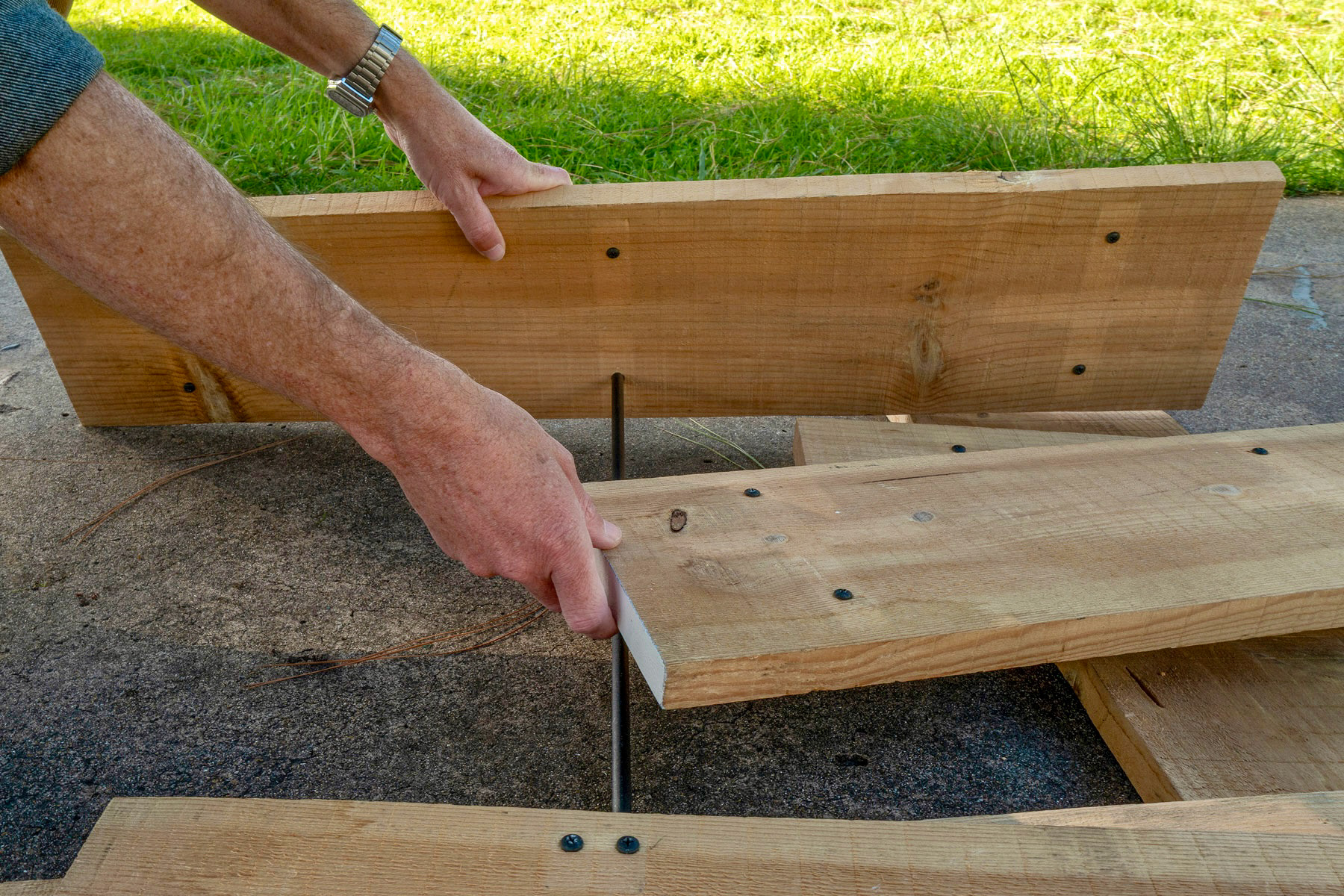 Spray paint, found steel round rod, black pan head screws to fill preexisting holes, scrap lumber