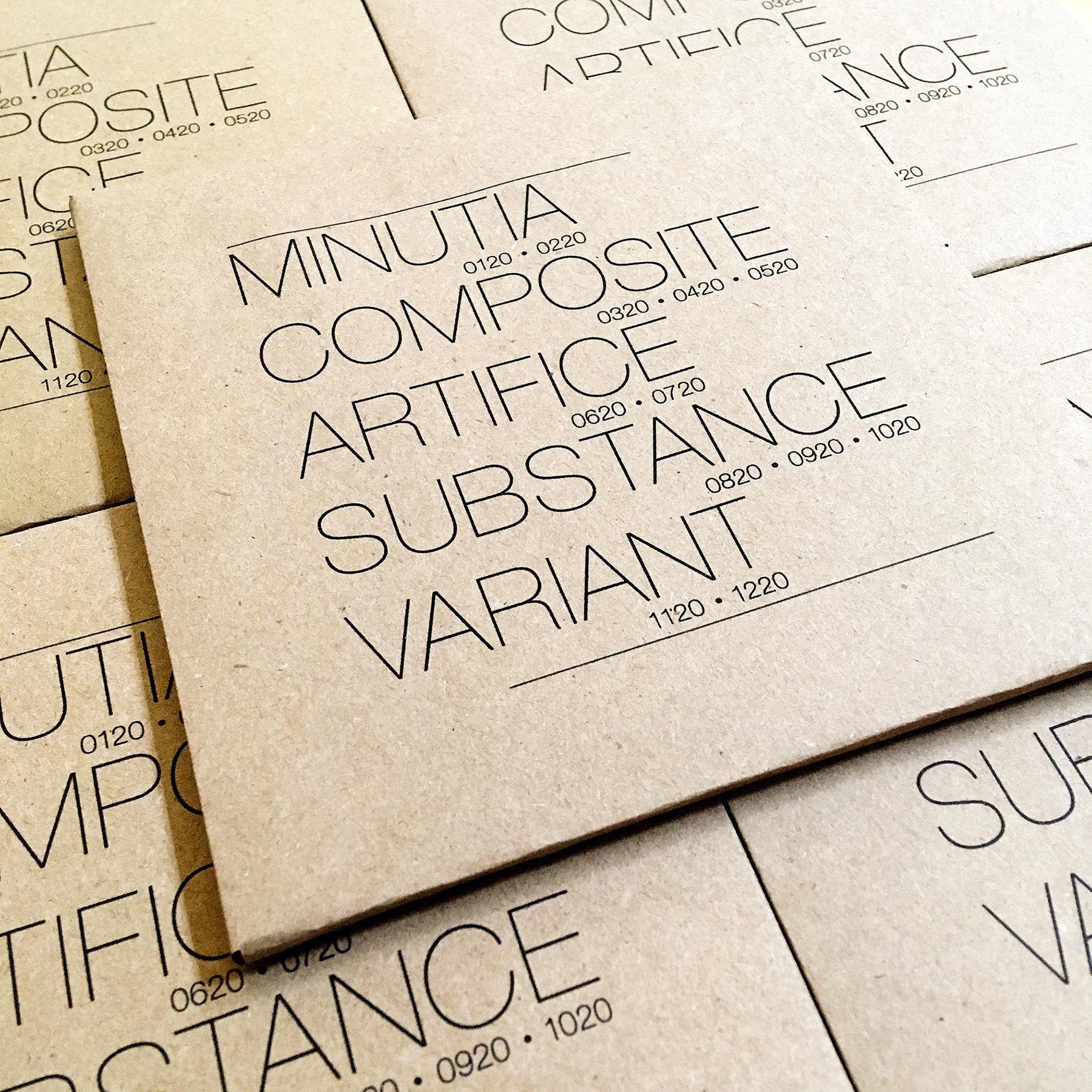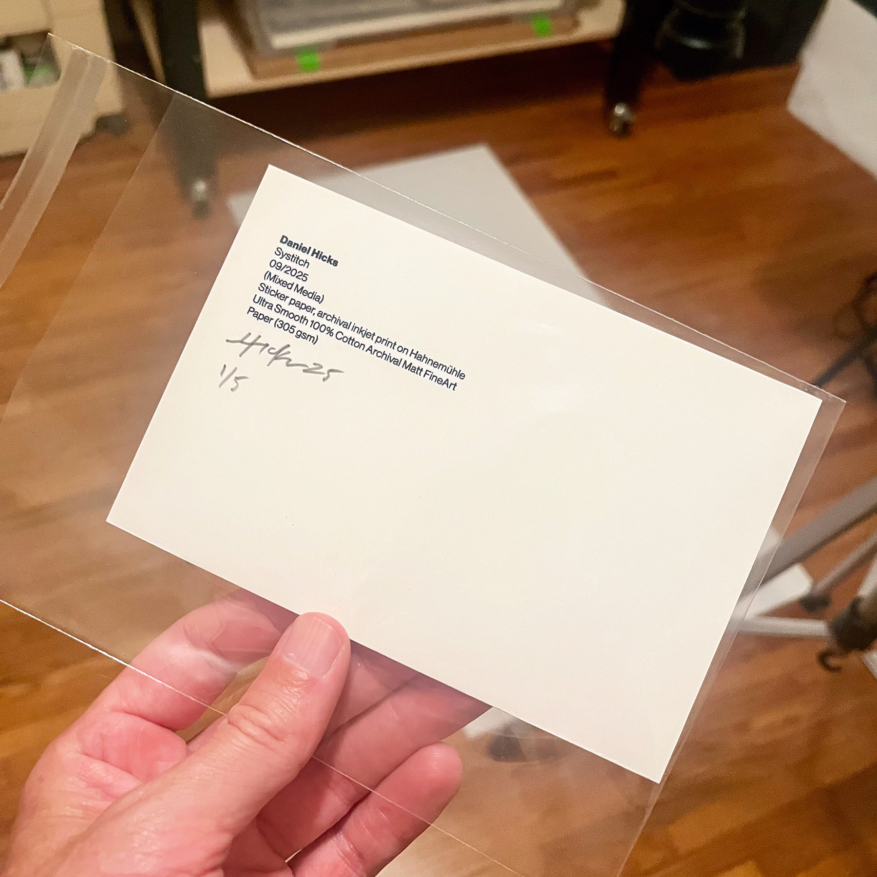 B&W postcards, hand cut colored vinyl, thermal labels, digital print on repurposed kraft board