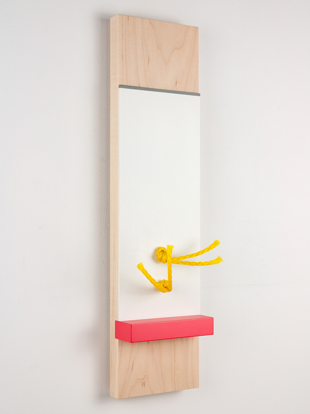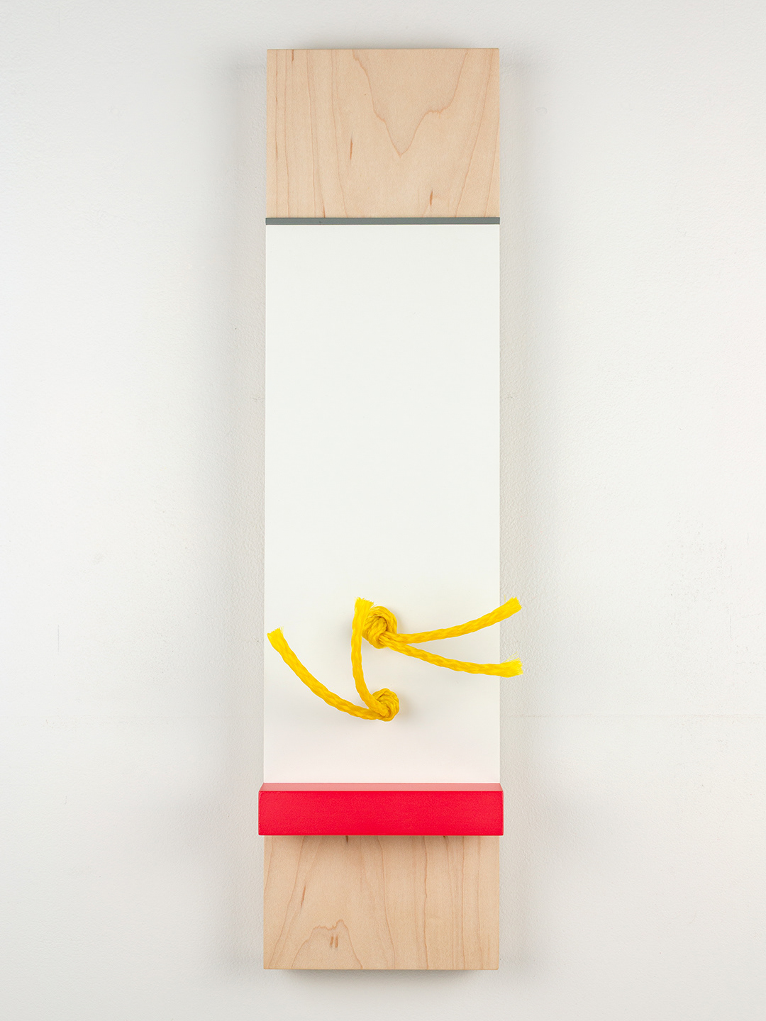 Spray paint, found rope, plastic (repurposed advertising panel), maple hardwood, basswood